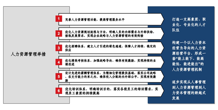 打造一支高素質、職業化、專業化的人才隊伍,構建一個以人力資本經營為導向的人力資源經營平臺,形成一套“能上能下、能高能低、能進能出”的人力資本管理機制,逐步實現從人事管理到人力資源管理到人力資本管理的跨越式發展。